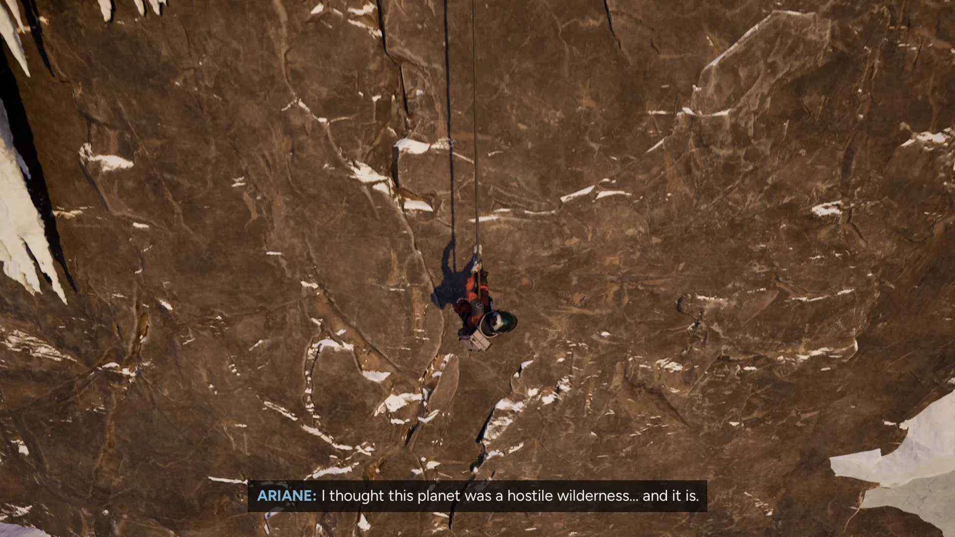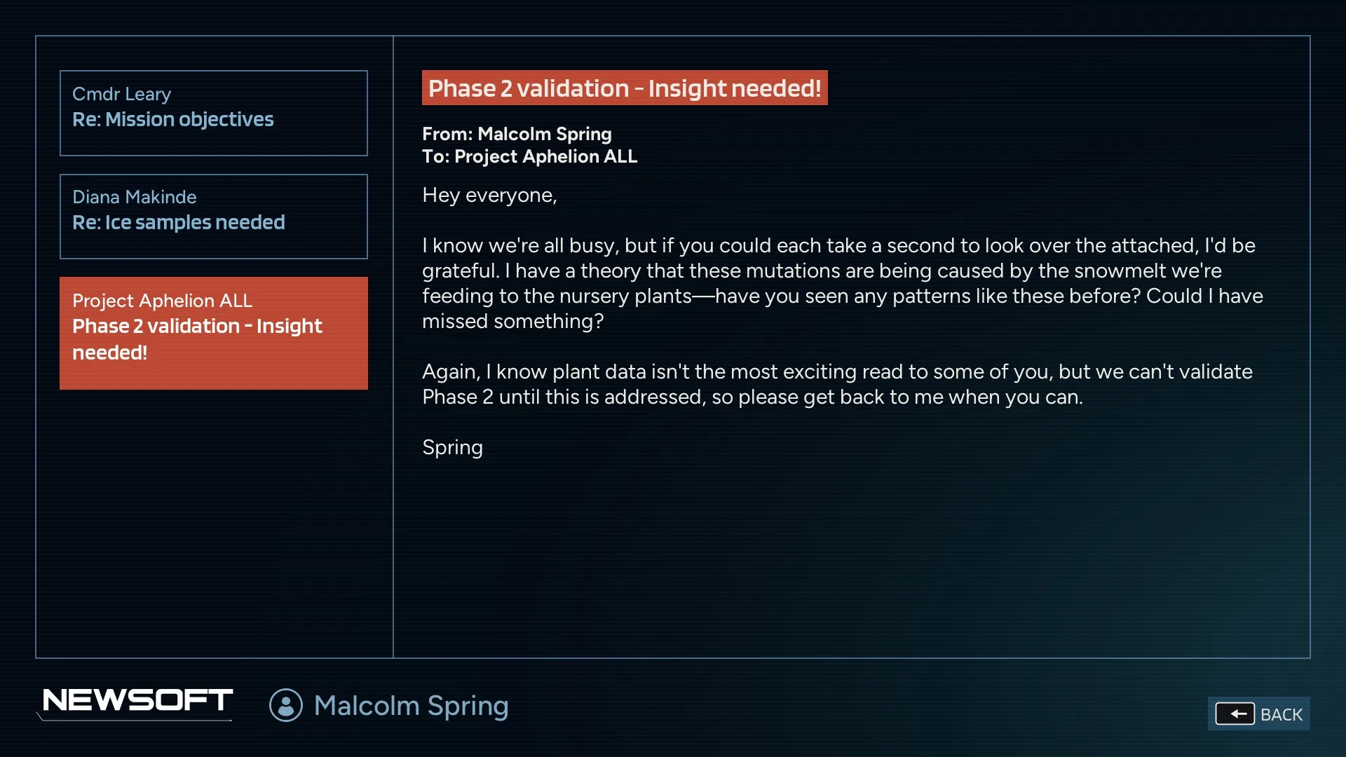 Ten je pre mňa najvýraznejším prvkom hry. Pomerne rýchlo zistíte, že nie ste prvou posádkou, ktorá sa po planéte pohybovala. Nachádza sa tu opustená základňa patriaca oveľa väčšiemu tímu. To, čo sa s ním stalo, postupne odhaľujete prostredníctvom e-mailov, zvukových záznamov a samotného prostredia. Ide o samostatnú dejovú líniu, ktorá funguje ako prequel k vašej misii a je minimálne rovnako pútavá ako príbeh Ariane a Thomasa. Získané informácie zároveň pomáhajú lepšie pochopiť udalosti, ktoré sa okolo vás odohrávajú.