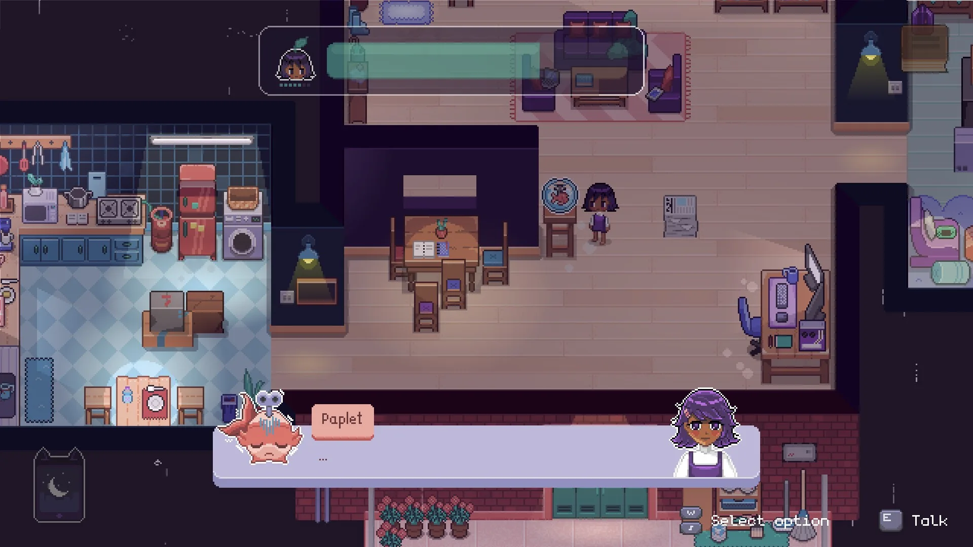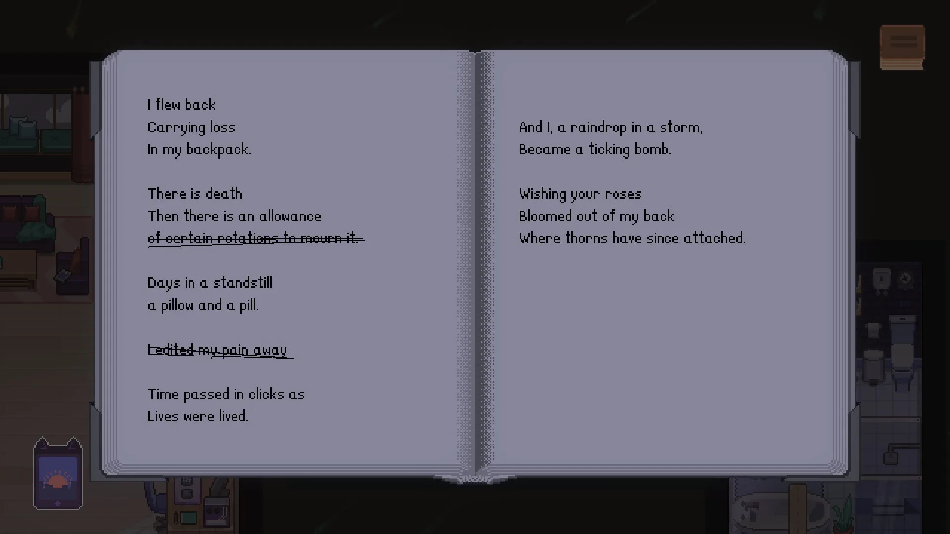 Vizuálne spracovanie je rovnako pôsobivé. Spomienky sú jemne tlmené, zatiaľ čo realita je farebne výraznejšia. Pixelart je veľmi pekný, najmä počas telefonátov, kde postavy ožívajú priamo pred vami. Oceňujem aj vizuálne znázornenie nálady Alo – od kvitnúcej rastlinky až po temné mraky či dokonca „čiernu dieru“ pri silnej bolesti.