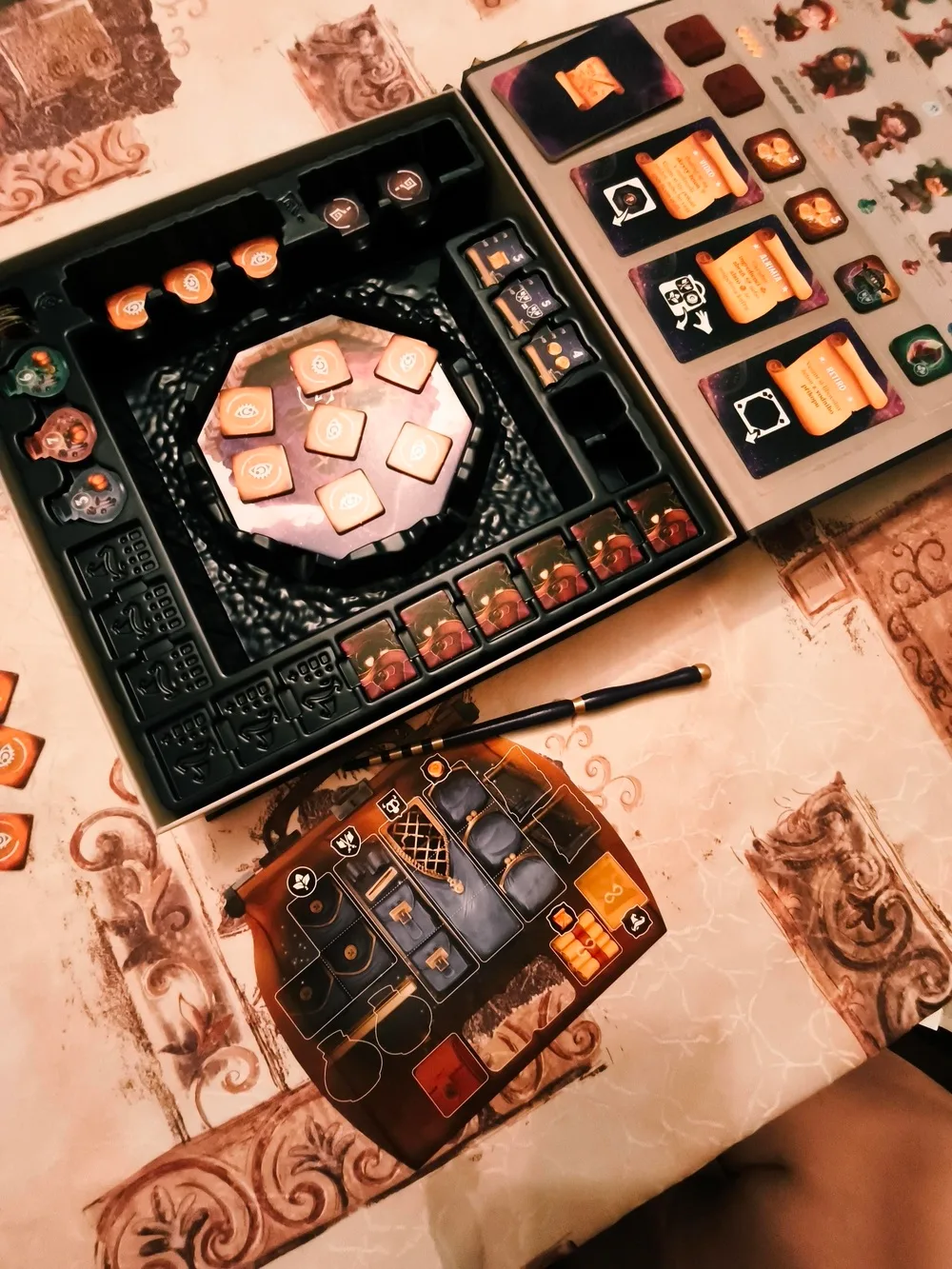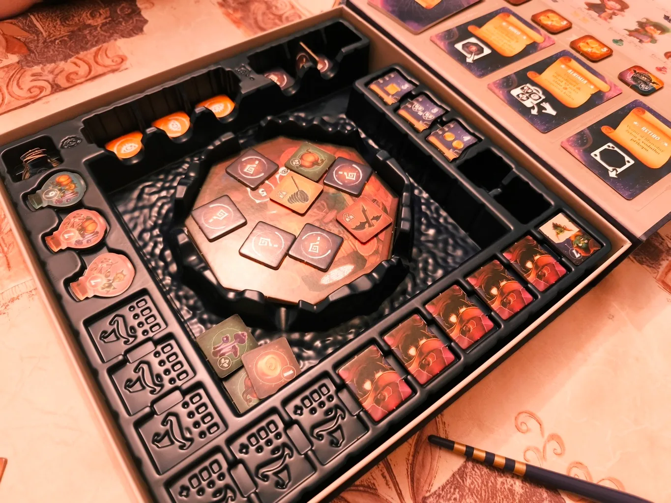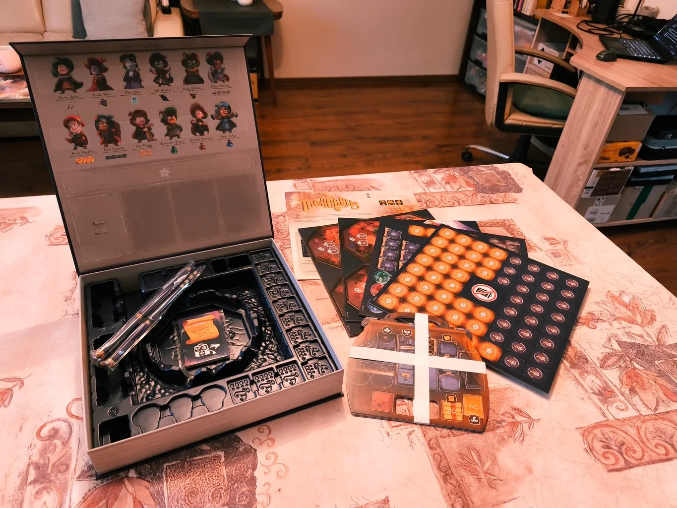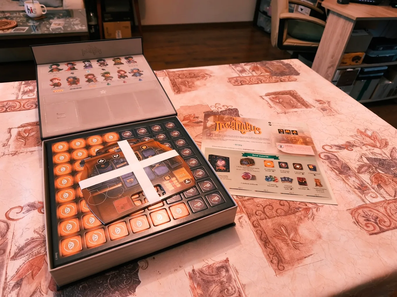 Súčasťou tejto spoločenskej hry je najmä herný obsah v kartónovom podaní. Ten si vylúpnete z dodaných rámčekov. A v tomto prípade dokonca aj prázdne rámčeky majú svoj účel, nielen rýchly let do koša. Podložíte si s nimi herný insert, aby ste ho mali vyššie a lepšie pod rukou. Šikovné. Plastový insert, ktorý znázorňuje magickú vežu obklopenú vodnou priekopou je základom hernej plochy, no aj veľmi dobrým riešením ako si elegantne roztriediť herné komponenty, než hru na istý čas odložíte do skrine. Po vylúpnutí kartónových žetónov a jednotlivých podlaží tajomnej veže sa vám do rúk dostávajú doštičky pre hráčov. Tie sú v podobe čarodejníckych kufrov a predstavujú inventár jednotlivých hráčov. Sú obojstranné, keďže Incantibus má 2 herné režimy.