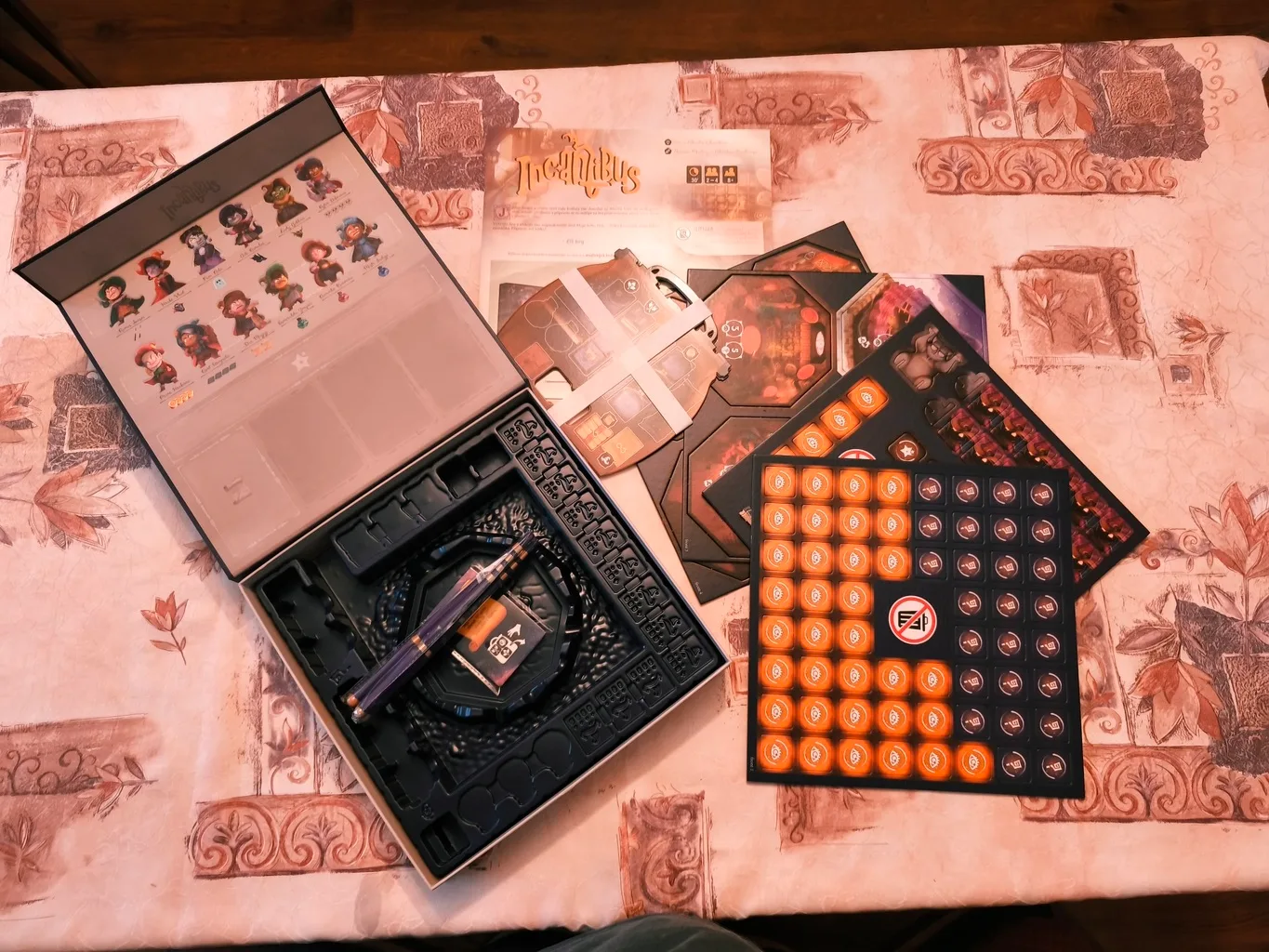 Spoločenská hra Incantibus už na prvý pohľad vyniká v zástupoch svojej konkurencie. Krabica s hrou doslova žiari, keďže názov vrátane rôznych ornamentov je pozlátený, čo dokáže upútať najmä zraky detí. Táto drobnosť však nie je jediným lákadlom tejto hry. Základ originality dizajnu spočíva v imitácii lexikónu kúzel. Krabica tak doslova navonok pripomína veľkú knihu, ktorú si otvoríte a pustíte sa do hry. Ide o pevnú kartónovú konštrukciu, ktorá ako bonus využíva magnety na zatváranie. Nápad je to vskutku zaujímavý, no na hranie si radšej pripravte trošku komornejšiu atmosféru, aby sa všetci hráči dostali s ľahkosťou k hernému obsahu. Ako hrací plán slúži primárne dno krabice, ale aj jej veko. Pri hraní je potrebné mať krabicu vodorovne, no veko sa mierne skláňa. Tento mierny neduh je však vyriešený vcelku vtipne. Môžete si ho podložiť kartónovou mačkou, ktorá slúži ako podpera.