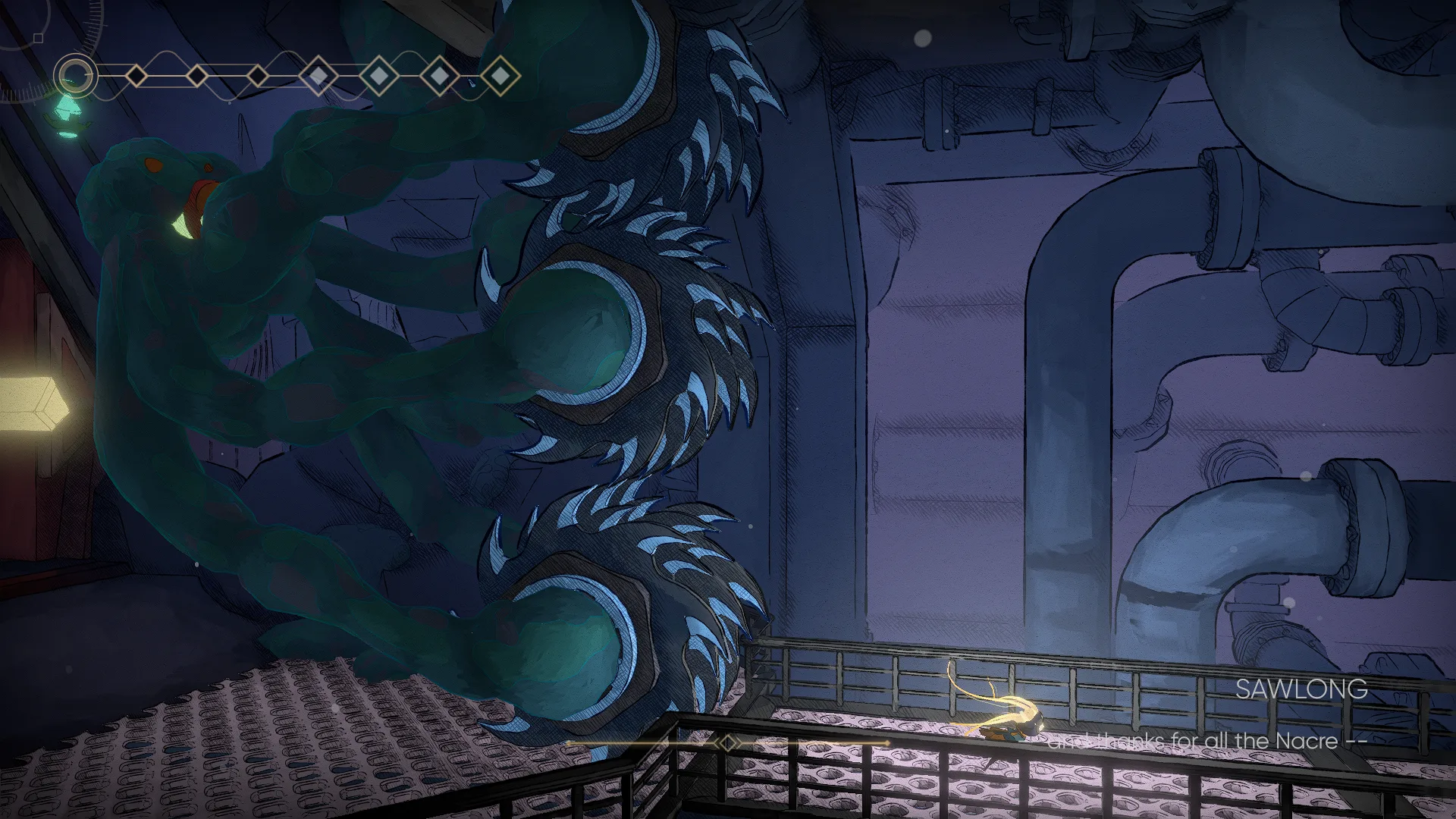 Tých je tu mimochodom celkom dosť, a vedia dosť potrápiť vaše schopnosti. Nie všetky súboje patria medzi náročné, no čím ďalej sa dostanete, tým väčšie výzvy na vás budú čakať. Väčšinu z nich je nutné poraziť v boji, no je tu aj jedna výnimka, a tou je Sawlong. Pred týmto bossom bude nutné utekať a zdolať vskutku náročnú sekciu, kde na konci mu uštedríte už len tri rany z milosti. Každý súper však potrebuje trochu inú taktiku, a vedia prekvapiť niekoľkými veľmi agresívnymi výpadmi. Ak by som však mal boss súboje v niečom skritizovať, je pravda, že niektorí mi pripomenuli protivníkov z iných hier. Najmä Calderon pôsobí ako Fourth Chorus zo Silksongu.