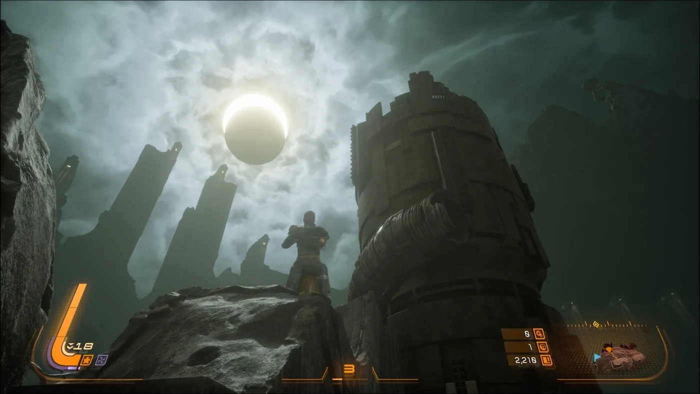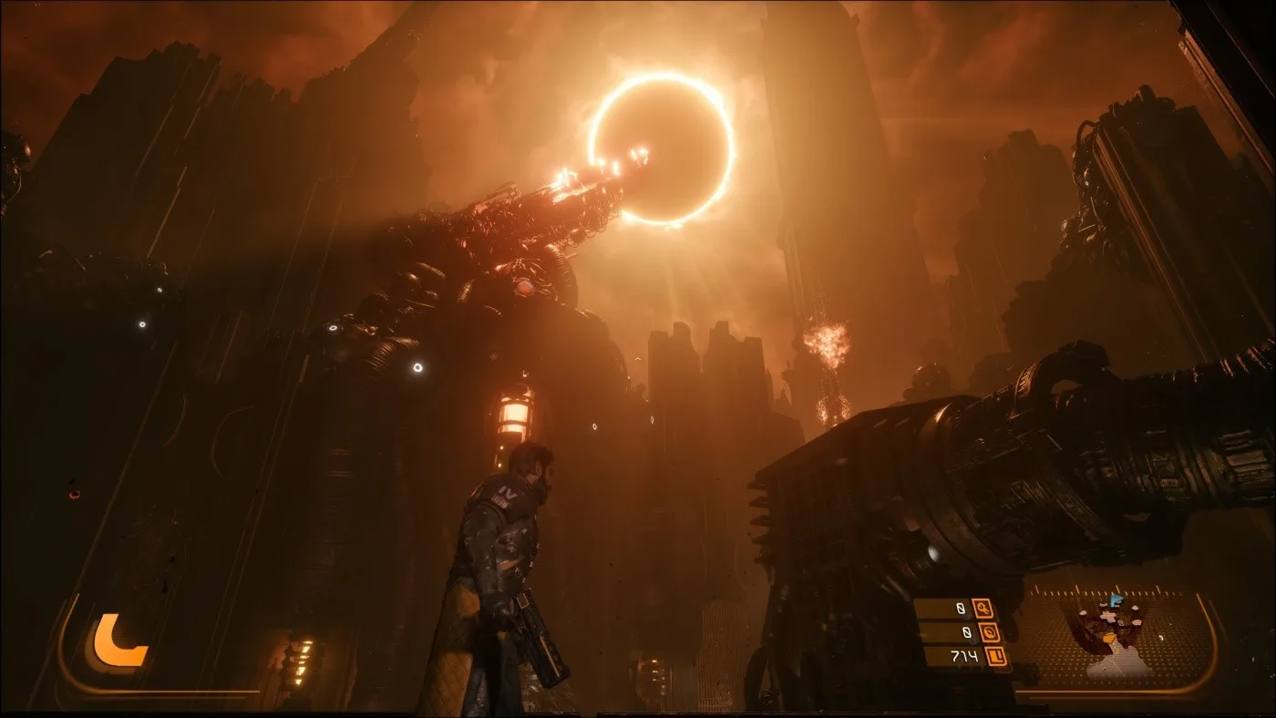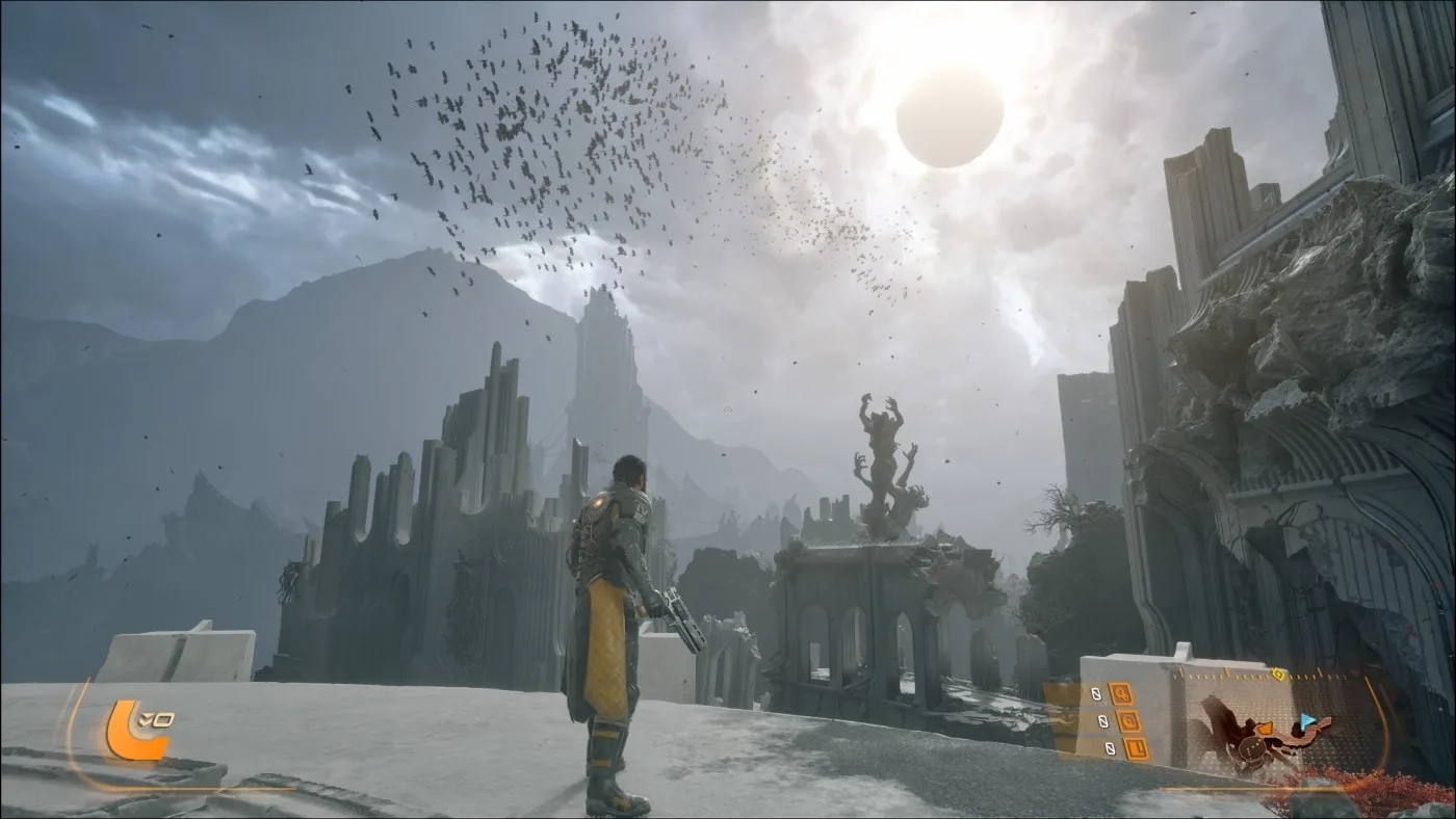 Dôležitým prvkom, podobne ako aj v Returnale, je cyklus opakovania. Smrť tak nie je pre Arjuna definitívny koniec, ale šanca na nový začiatok. Arjun sa po každom páde vracia späť, čo vytvára zaujímavý naratívny rámec, kde sa príbeh odhaľuje postupne cez opakované pokusy. A aby som nezabudol na spomínané zatmenie, to nepredstavuje iba pekný vizuálny efekt, ale má svoje opodstatnenie aj z hľadiska hrateľnosti, pretože cez "deň" je síce Carcosa nebezpečná, no práve po zatmení nastane to pravé peklo.