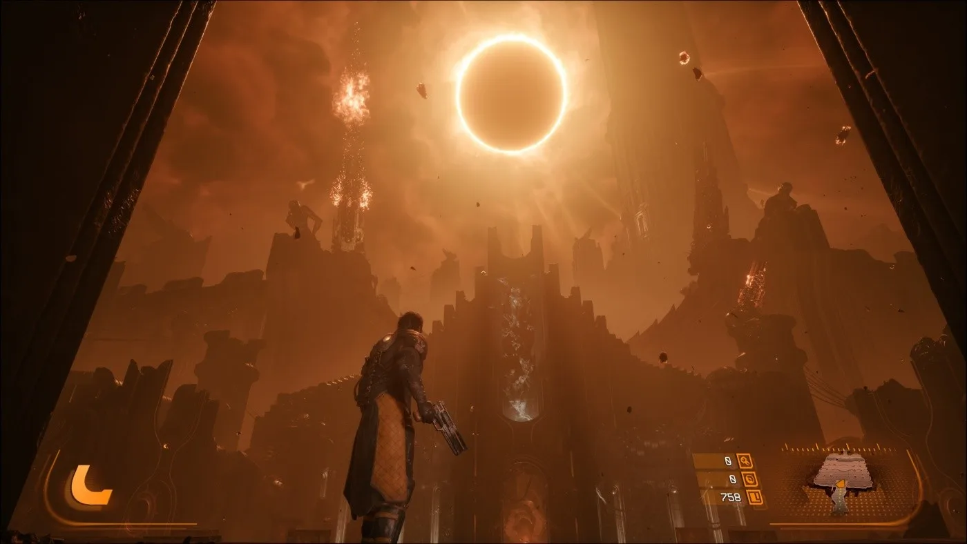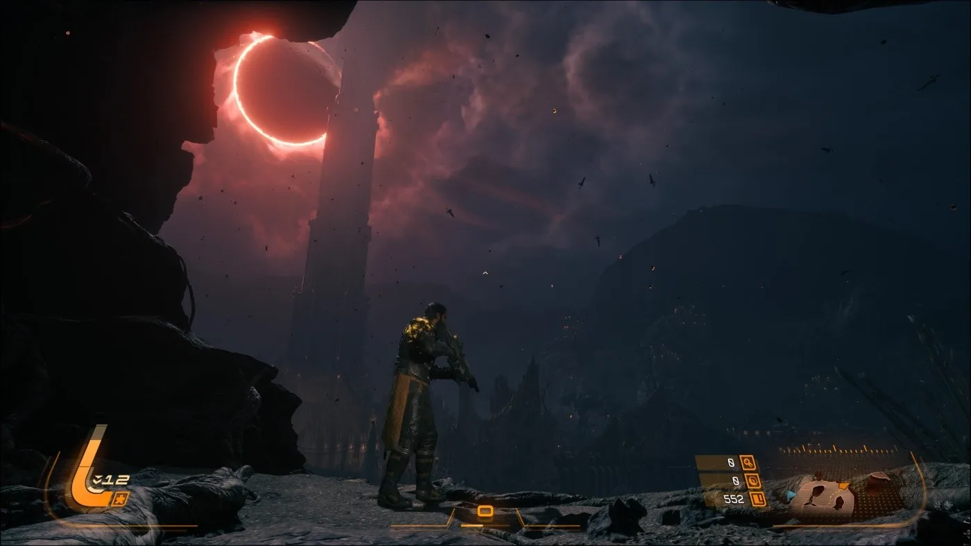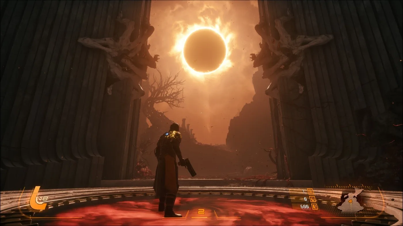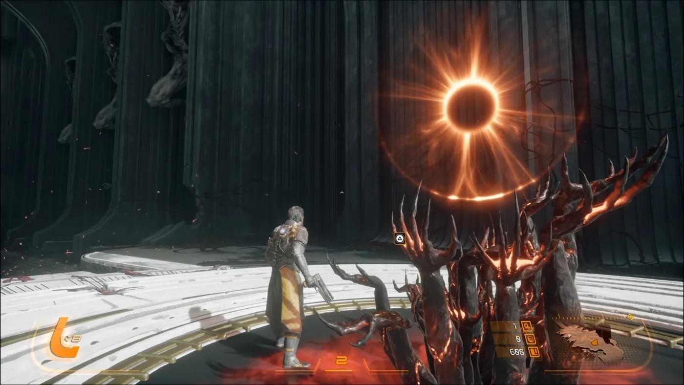 Dôležitým prvkom, podobne ako aj v Returnale, je cyklus opakovania. Smrť tak nie je pre Arjuna definitívny koniec, ale šanca na nový začiatok. Arjun sa po každom páde vracia späť, čo vytvára zaujímavý naratívny rámec, kde sa príbeh odhaľuje postupne cez opakované pokusy. A aby som nezabudol na spomínané zatmenie, to nepredstavuje iba pekný vizuálny efekt, ale má svoje opodstatnenie aj z hľadiska hrateľnosti, pretože cez "deň" je síce Carcosa nebezpečná, no práve po zatmení nastane to pravé peklo.