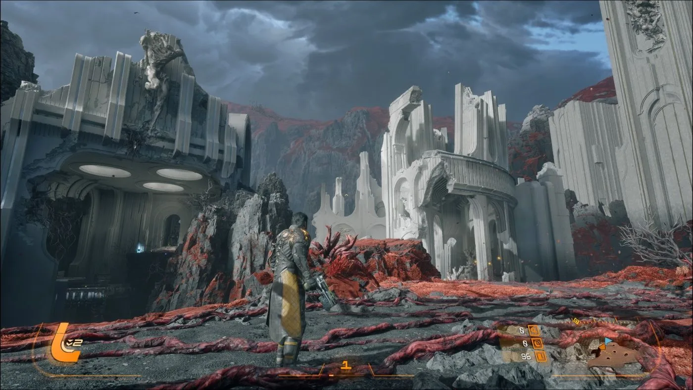 Prostredia sú výrazne rozmanitejšie než v Returnale. Každá lokalita má vlastnú identitu, farebnú paletu aj architektúru, čo eliminuje pocit repetitívnosti. Veľkú rolu zohráva aj práca so svetlom a časticovými efektmi, ktoré dodávajú súbojom dynamiku a vizuálnu hĺbku. Carcosa vyzerá naozaj pôsobivo a ja môžem vývojárov z Housemarque iba pochváliť, odviedli totiž fantastickú prácu.
