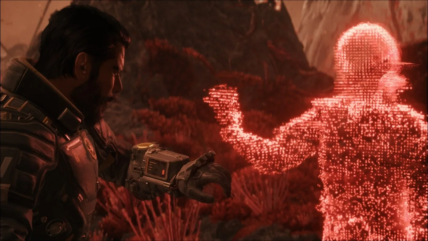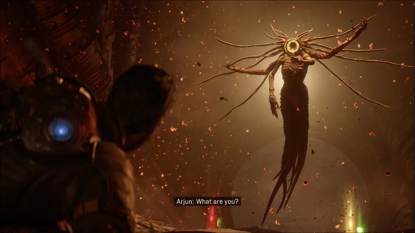 Silnou stránkou je aj postupné dávkovanie informácií. Príbeh sa odhaľuje cez audio logy, texty a rozhovory s ostatnými preživšími v hube Passage, čo vytvára neustály pocit tajomstva. Zároveň sa Arjunov osobný príbeh postupne prepája s väčšou záhadou planéty Carcosa, sveta, ktorý pôsobí ako živá, meniaca sa entita s vlastnými pravidlami. Názov Carcosa pritom nie je náhodný a odkazuje na dlhú tradíciu v literatúre a popkultúre, kde predstavuje tajomné a často prekliate miesto. Aj v Sarose ide o znepokojivý, neustále sa meniaci svet, ktorý síce nie je čisto hororový, no dokáže vyvolať silný pocit nepokoja. Hra si tak udržiava napätie až do samotného konca, pričom aj keď sa odpovede postupne objavujú, atmosféra neistoty nikdy úplne nezmizne. Saros zachováva istú dávku tajomna, takže fanúšikovia hlbších významov neprídu skrátka, len tentoraz nie je všetko zahalené v tak hustej hmle ako predtým.