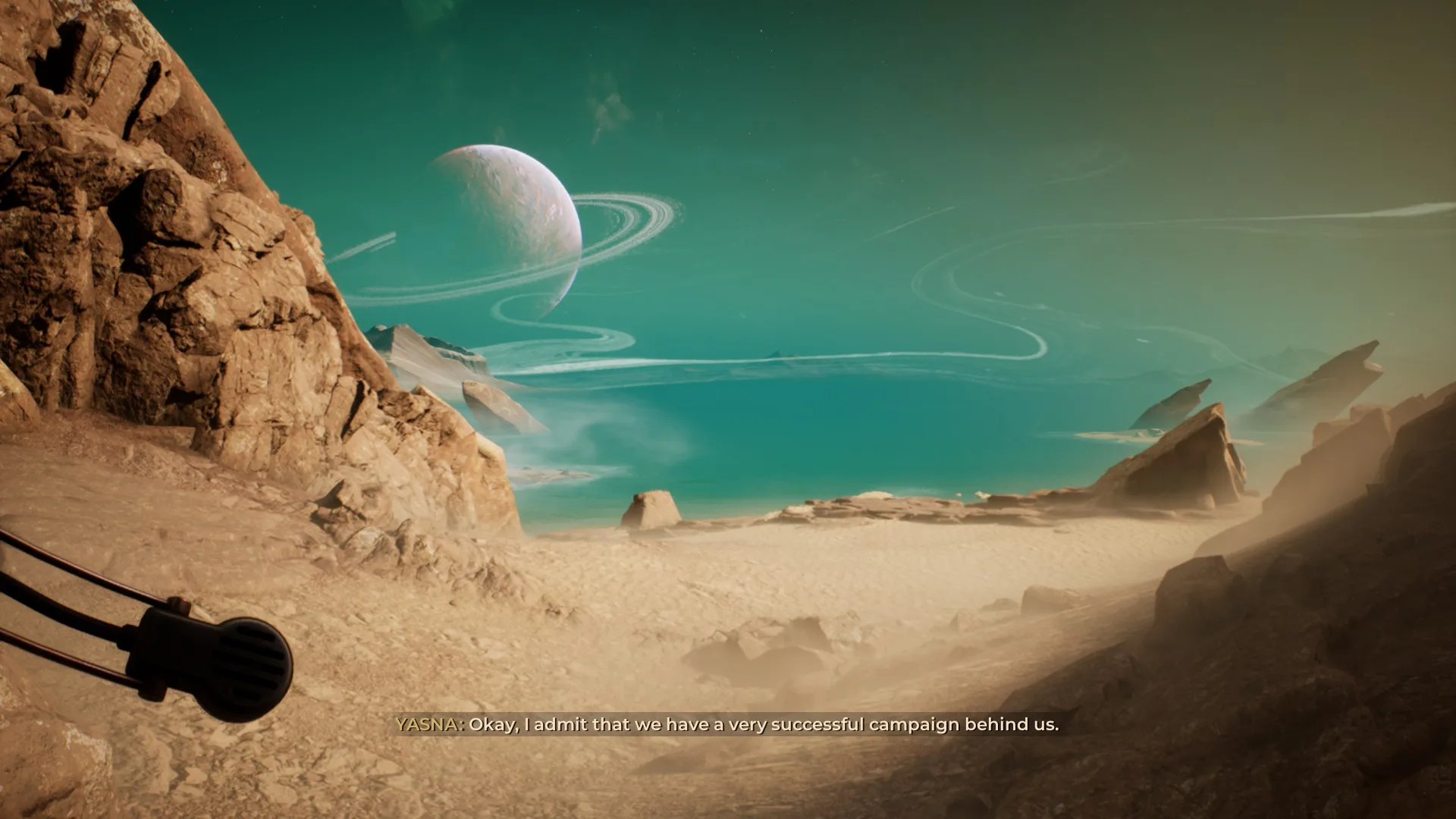 Mal by som ešte pochváliť aj vizuálnu stránku. Grafika je podľa mňa solídna, Regis III pripomína v určitých miestach nádherné prírodné kaňony vytvorené v púštiach, no rovnako tu viete nájsť aj malé jazierka s vodou (či je pitná je však otázne), dostanete sa do zaujímavo vybudovanej časti, ktorú Yasna nazve ako „City“ a okrem toho na oblohe budete mať i nádherný výhľad na okolité planéty a mesiace, ktoré sú často neuveriteľne blízko. V hre som však našiel aj niekoľko grafických glitchov a okrem toho som si všimol, že aj keď vonku je vietor a v púšti sa vytvárajú dokonca malé tornáda, oblaky sa nehýbu ani o milimeter. Malý detail, ale dal by tej planéte predsa len o niečo viac života. V rámci celkového kontextu však ide o zanedbateľné maličkosti.